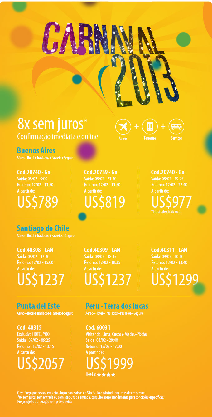 Está pensando em dar uma escapadinha do Brasi no Carnaval em 2013? Temos ótimas opções para você.